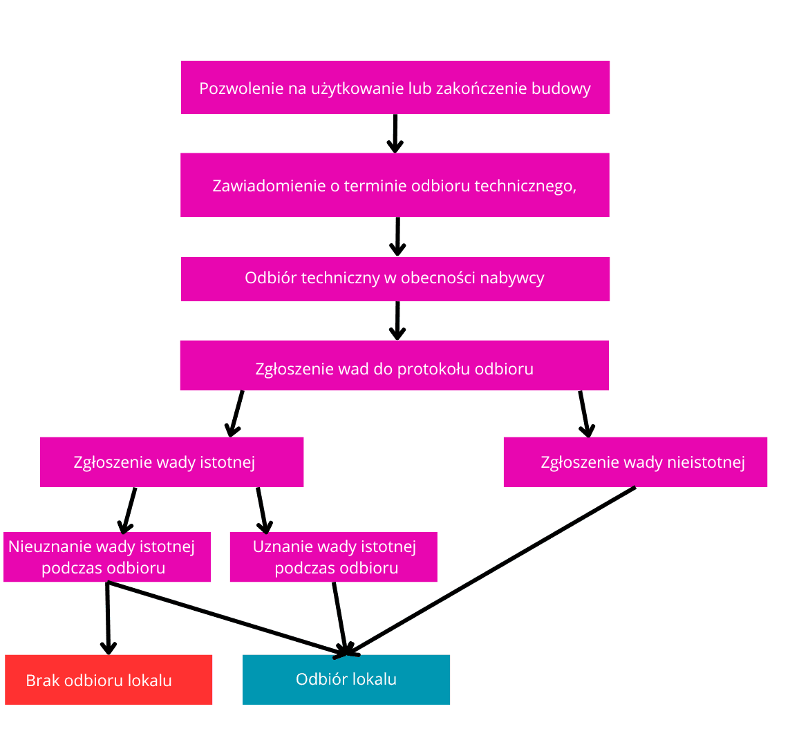 Zgodnie z Ustawą z dnia 20 maja 2021 r. o ochronie praw nabywcy lokalu mieszkalnego lub domu jednorodzinnego oraz Deweloperskim Funduszu Gwarancyjnym, czyli tzw. „ustawą deweloperską”, po uzyskaniu pozwolenia na użytkowanie lub zawiadomieniu organu nadzoru budowlanego o zakończeniu budowy domu jednorodzinnego przy braku sprzeciwu ze strony tego organu Deweloper wyznacza termin odbioru (wydania) lokalu mieszkalnego. Na odbiorze tym musi stawić się nabywca, który ma prawo na podstawie sprawdzenia stanu technicznego nieruchomości zgłosić do protokołu odbioru wady lokalu lub domu. Zmiany, które weszły w życie od 1 lipca 2022 r. przewidują również możliwość odmowy odbioru w przypadku wystąpienia wad istotnych. Sprzedawca (w tej roli Deweloper) ma zgodnie z Kodeksem Cywilnym oraz ustawą Deweloperską 14 dni na ustosunkowanie się do zgłoszonych uwag oraz 30 dni na usunięcie wad zasadnych od dnia podpisania protokołu odbioru. O ile termin 14 dni jest w żaden sposób nie do zmiany, to termin na usunięcie usterek może zostać wydłużony ale tylko w sytuacji jeżeli Deweloper poda realną przyczynę opóźnienia wraz z nowym terminem.